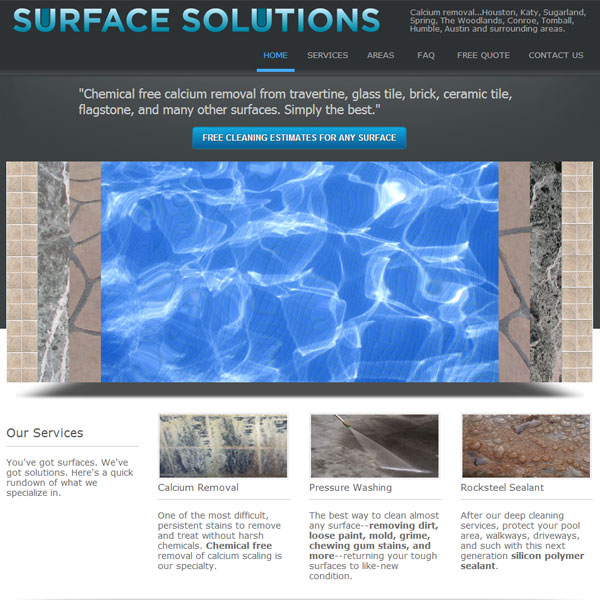 Surface Solutions is out to conquer calcium deposits on pools and many other types of home and business exteriors with a unique technology called bead blasting. It’s environmentally friendly, kid and pet friendly, and much more cost effective than the harsh chemicals that are normally used. GFD built them a custom responsive WordPress website with plenty of info and a contact form to grow their business, gain new leads, and service clientele across the U.S.